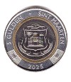 錢幣材質為外圈:鍍鎳鋼( Nickel Plated Steel ),內圈:鍍銅鋼 ( Bronze Plated Steel ),內圓鍍鎳鋼( Nickel Plated Steel )合金,直徑 25.85mm,重8.5g。註:本枚為聖馬丁版,另有古拉索版本。邊緣刻有" God zij met ons "(願上帝與我們同在)字樣。 |